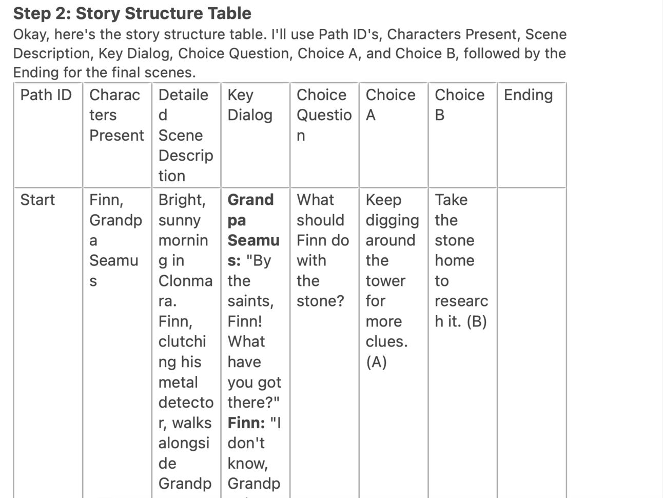After the framework was in place, AI assistance was needed. I described what I wanted to the best of my ability and asked AI to write a prompt that would generate the output I was looking for. Surprisingly, I described the problem well enough that the first try generated close to what I was looking for. After a few iterations and changes I was starting to get pretty nice output. However, the stories were not great so I asked it to write a prompt that generated better stories and it did!!
